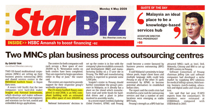 • 4 May 2009, The Star – Two MNCs Plan Business Process Outsourcing Centres